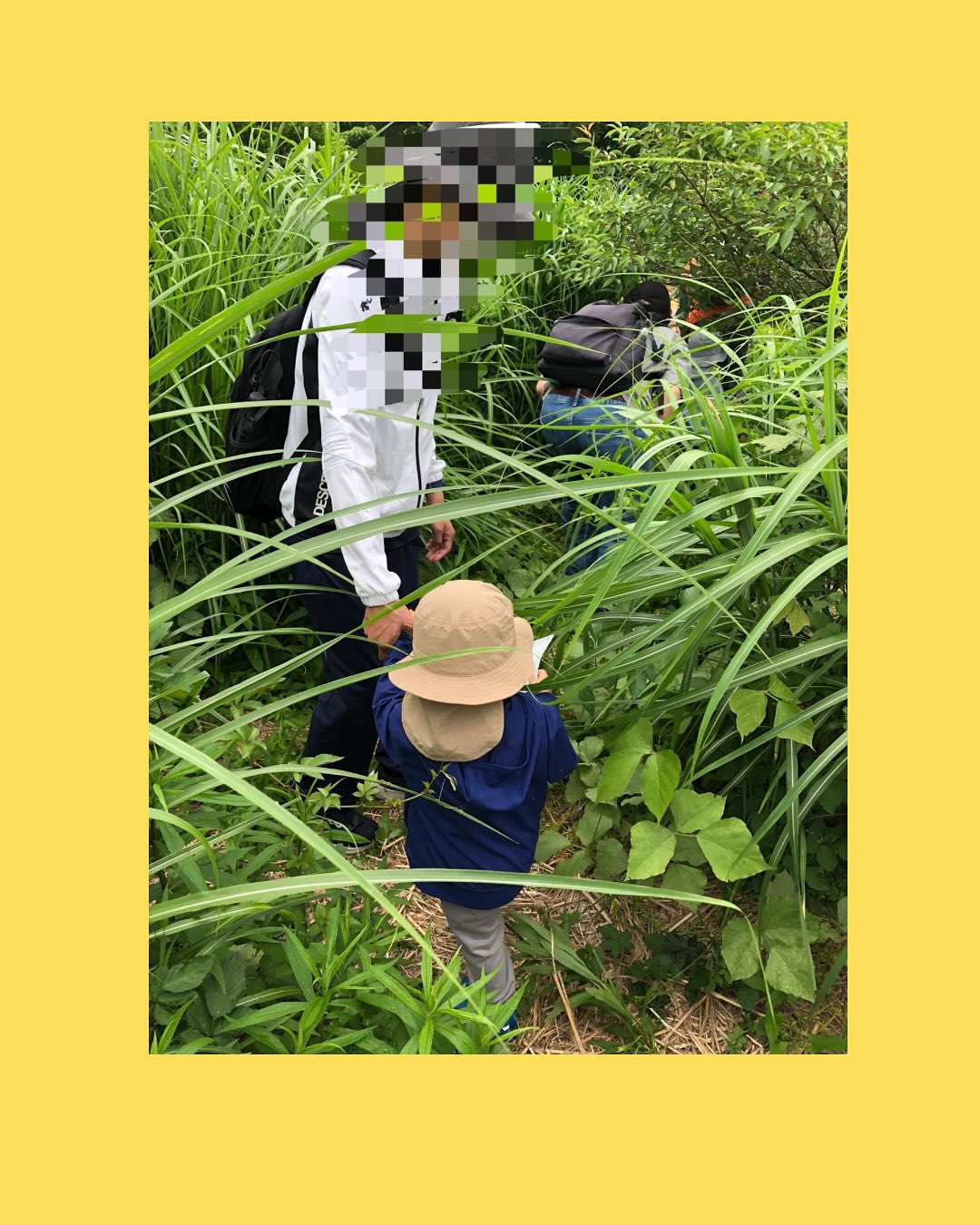 プログラムの説明や自己紹介などを行ってから、みんなで探検へ出発。広場の草花を見たり、青々としたススキの原っぱをくぐったりしました。